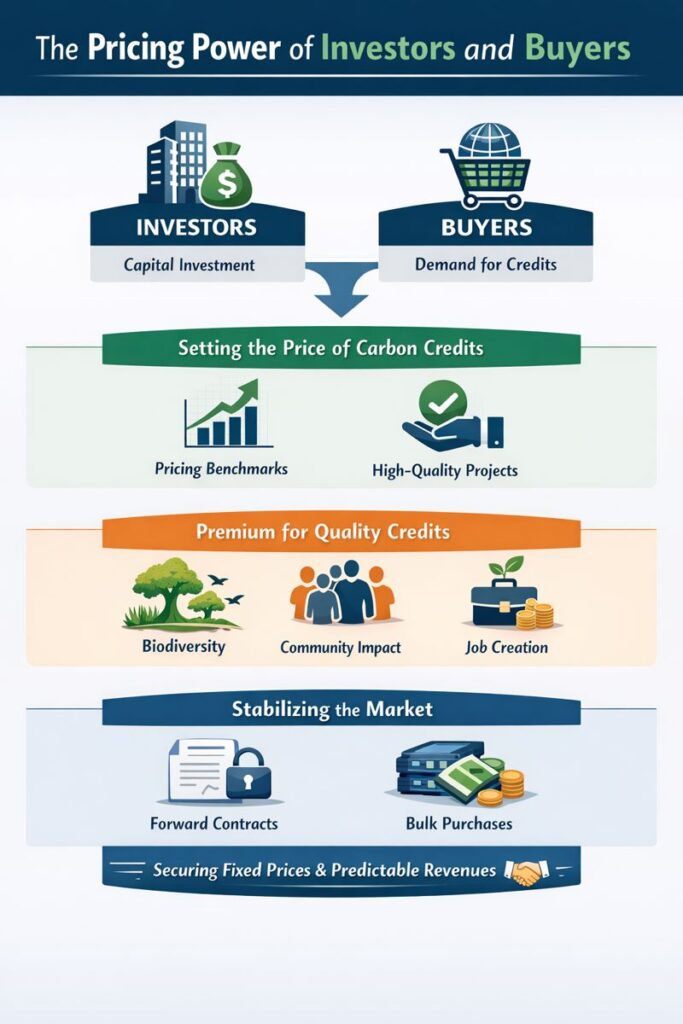 Both investors and buyers play an essential role in setting the price of carbon credits. Investors, through their capital injections, influence the financial viability of carbon credit projects, helping to establish pricing benchmarks. On the buyer’s side, demand for credits, especially those tied to high-quality projects, directly impacts market pricing.